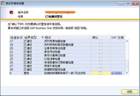 如果檢測到警告信息,則點(diǎn)擊'詳細(xì)信息'打開預(yù)遷移測試結(jié)果窗口,向?qū)?huì)列出警告的具體描述信息以及SAP注釋: