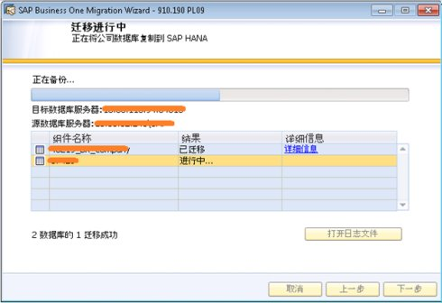 在遷移過程中,向?qū)?huì)先進(jìn)行數(shù)據(jù)庫的備份,然后將公司數(shù)據(jù)庫復(fù)制到SAP HANA中。向?qū)б矔?huì)顯示進(jìn)度條以及遷移結(jié)果。遷移完成后,點(diǎn)擊'打開日志文件',可以查看遷移的具體日志信息。點(diǎn)擊'下一步':