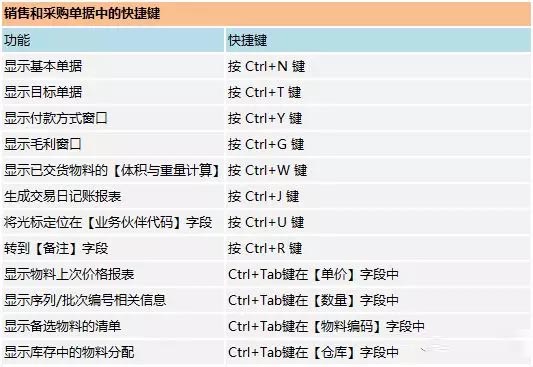 銷售和采購單據(jù)中的快捷鍵